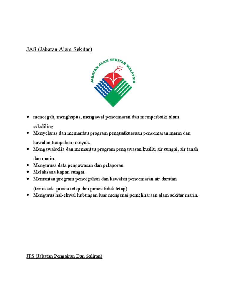 1 September - dinaikkan taraf sepenuhnya kepada sebuah Jabatan - Jabatan Alam Sekitar Malaysia JAS. Peranan Jabatan Alam Sekitar. Pelan Tindakan Pembersihan Pantai PTPP 4.